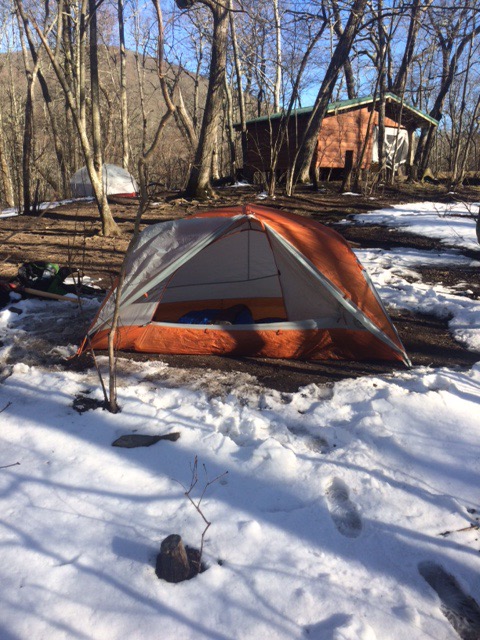 Pitching my tent for night in snow! Building in background is shelter. Guess we’ll find out how warm my tent is!